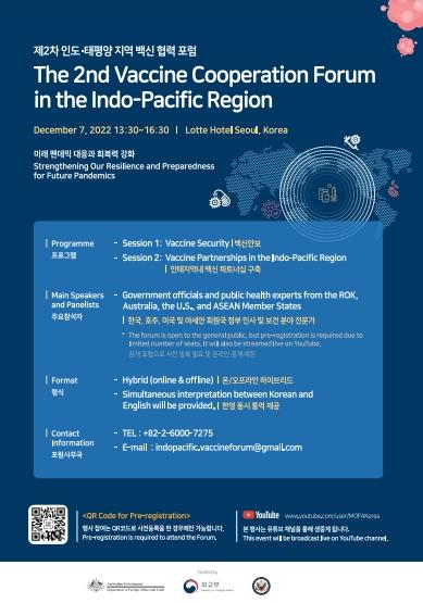 미래 팬데믹 대응과 회복력 강화를 주제로 코로나19 이후 유사 보건 위기에 대비해 인태지역에 특화된 역내 공조 전략과 외교·보건 분야를 통합한 글로벌 협력 플랫폼 구축 방안도 함께 논의될 예정이다.