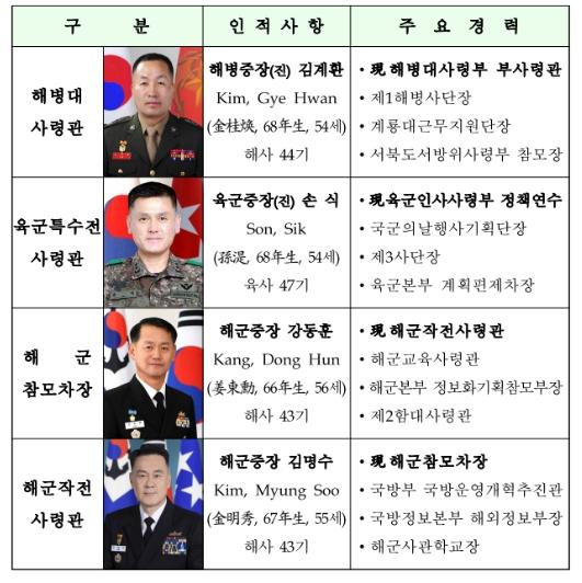 이번 인사는 중장급 이하의 진급 선발과주요직위에 대한 보직인사로서, 육군소장 강호필, 권영호, 손식을 진급시켜 군단장,육군사관학교장, 육군특수전사령관으로, 해군소장 황선우를 진급시켜, 해군사관학교장으로, 해병소장 김계환을 진급시켜, 해병대사령관으로임명할 예정이다.