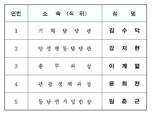 승진내정자는 △강지현 양성평등담당관 △윤희천 관광정책과장 △임춘근 동남권사업반장 △김수덕 기획담당관 △이계열 총무과장 등 5명이다.