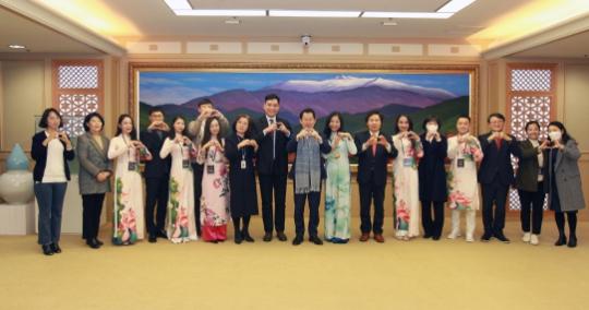 [중앙뉴스라인, 김영환기자] 문영훈 광주광역시 행정부시장이 9일 시청에서 문화교류 행사를 위해 방문한 베트남 응에안성 쩡 칸 툽 외무국 국장, 응웬 티 마이 트엉 인민위원회 사무국 부국장, 전통문화예술센터 예술인 등과 만나 문화교류 방안을 논의한 뒤 기념촬영을 하고 있다.
