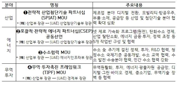 [중앙뉴스라인, 김영환기자] 윤석열 대통령의 UAE 순방 계기, 2023년 1월 15일 산업통상자원부 및 에너지와 산업분야 유관기관?기업들은 UAE 측과 총 7건(산업 1건, 에너지 5건, 무역·투자 1건)의 공동성명, 양해각서 또는 계약을 체결했다.