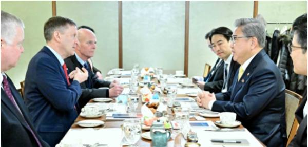 [중앙뉴스라인, 김영환기자] 박진 외교장관은 1월 25일 방한 중인 Mark Green 윌슨센터 회장과 Stephen Biegun 전 미 국무부 부장관을 비롯한 미국 전직 의회, 행정부 및 학계 인사들을 접견하고, 한미동맹, 북한 문제, 인도-태평양 전략, 역내 정세 등에 대해 의견을 교환했다.