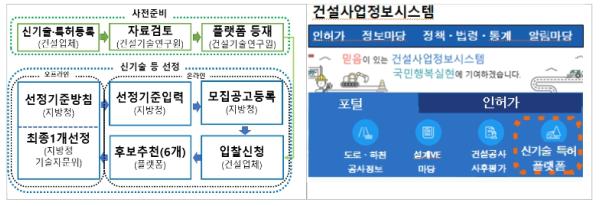 한편, 특정공법 선정에 참여하고자 하는 기술개발자 또는 기업 등은 특정공법 후보 모집 공고에 따라 건설사업정보시스템의 플랫폼에 접속하여 개발ㆍ보유한 건설신기술 또는 특허 등을 등재 후 신청하면 된다.