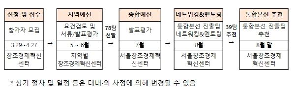 각 지역 창조경제혁신센터별로 (예비)창업자를 모집하며, 지역별 선정평가(서류·발표평가)로 진행되는 지역예선을 통해 총 78개팀을 선발하여 종합예선에 진출하게 된다.