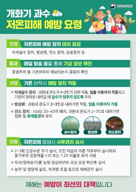이에 따라 농식품부는 관계기관 회의를 통하여 시기별 주요 재해 현황과 기관별 역할을 점검하고 피해 예방을 위한 개선방안을 마련했으며, 개화기인 4월에 발생할 수 있는 저온 피해 예방 활동부터 적용할 계획이다.