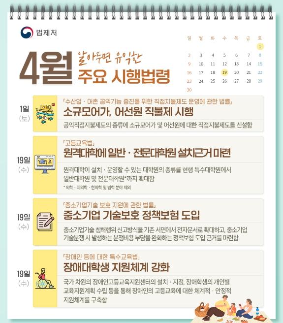 [중앙뉴스라인, 장성대기자] 법제처는 4월에 총 70개의 법령이 새로 시행된다고 밝혔다. 주요 시행법령의 내용과 시행일은 다음과 같다.