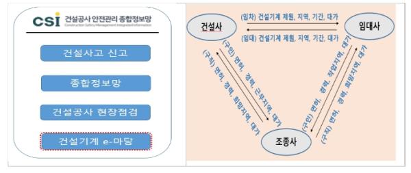 ‘건설기계 e-마당’은 건설안전종합정보망에 구축됐으며, 기존 가입한 건설사 등은 회원가입 없이, 건설기계 임대사ㆍ조종사는 회원가입을 통해 건설기계 임차, 임대 및 조종사 구인ㆍ구직 정보 등을 휴대폰(모바일 웹)ㆍ컴퓨터(PC 웹)로 무료 검색ㆍ신청할 수 있다.