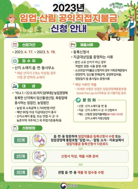 [중앙뉴스라인, 장성대기자] 산림청은 2023년 4월17일부터 5월 19일까지 2023년 임업ㆍ산림 공익직접지불금을 신청받는다고 밝혔다.