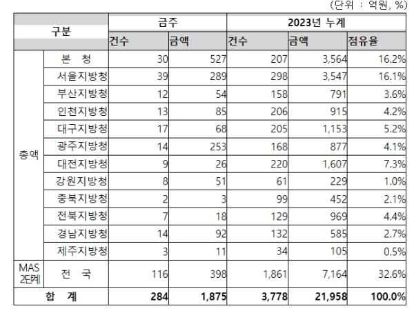 지역별 발주량을 보면, 총액계약 대상 1,477억 원 중 본청이 527억 원으로 35.7%를 집행하고 서울청 등 11개 지방청에서 950억 원을 각각 집행할 예정이다.