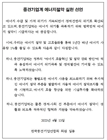 중견기업계는 “중견기업계 에너지절약 실천 선언”을 통해 향후 5년간‘매년 에너지 사용량 1% 감축’목표를 제시하고, 기업의 에너지 효율혁신을 위한 시설투자 확대 및 정부 에너지 절약정책 적극 동참 등 자율적 에너지 절감을 위해 적극 노력하기로 다짐했다.