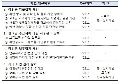 또한 갈수록 다양화되는 취업 방식과 대학 진학 형태를 고려하여 장려금 지급의 기준을 명확히 하고, 장려금 지급 전 보증보험 가입을 의무화하는 등 지급?환수체계도 함께 개선할 예정이다.