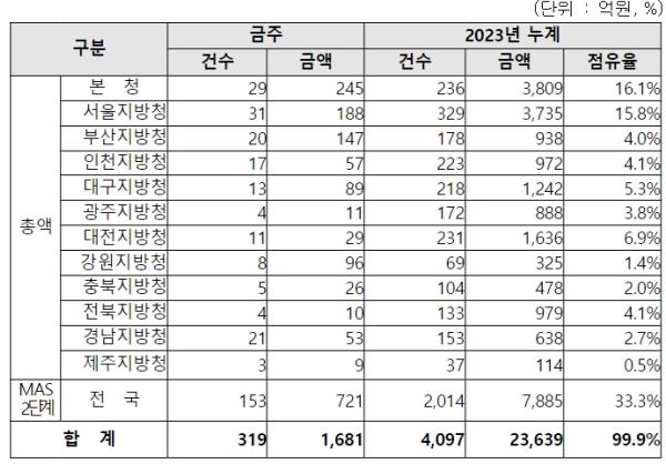 지역별 발주량을 보면, 총액계약 대상 960억 원 중 본청이 245억 원으로 25.5%를 집행하고 서울청 등 11개 지방청에서 715억 원을 각각 집행할 예정이다.