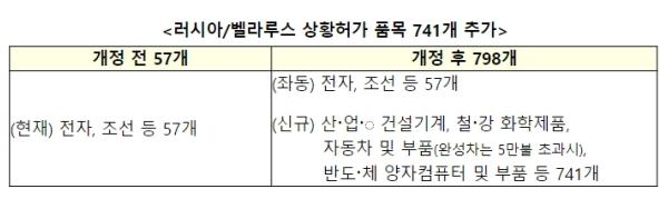 한편, 러시아/벨라루스에 대한 상황허가* 품목이 기존 57개에서 798개로 확대됨에 따라 4.28일 0시부터 해당 품목의 러/벨向 수출은 원칙적으로 금지된다.