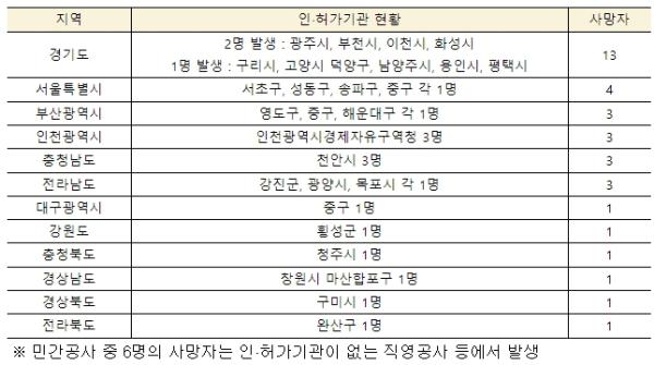민간공사에서 발생한 사망자는 41명으로 전년 동기 대비 4명 감소했으며, 사망자가 가장 많았던 인·허가 기관은 인천광역시경제자유구역청, 충남 천안시로 각 3명의 사망자가 발생했다.