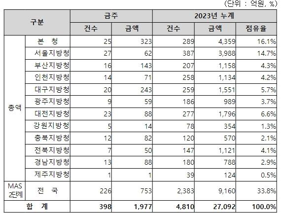 지역별 발주량을 보면, 총액계약 대상 1,224억 원 중 본청이 323억 원으로 26.4%를 집행하고 서울청 등 11개 지방청에서 901억 원을 각각 집행할 예정이다.