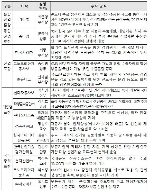 이날 기념식에서 자동차산업 발전 유공자 34명은 정부포상을 수상했으며, 은탑산업훈장은 최준영 기아 부사장, 동탑산업훈장은 문종식 다성 상무, 산업포장은 최종 한국지엠 부사장 외 2명, 대통령표창은 김치경 현대자동차 상무 외 3명, 국무총리표창은 김경노 한국아이티더블유 연구소장 외 4명, 그리고 20명의 자동차산업 발전 유공자들에게 산업통상자원부장관표창을 수여했다.