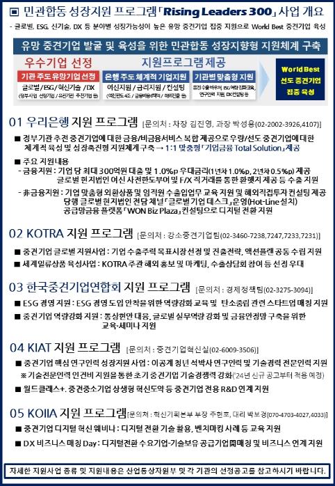 [중앙뉴스라인, 우제헌기자] 산업통상자원부와 우리은행(은행장 이원덕)은 5월 12일 중견기업 전용 금융지원 프로그램 '라이징 리더스(Rising Leaders) 300' 지원대상 기업을 모집한다.