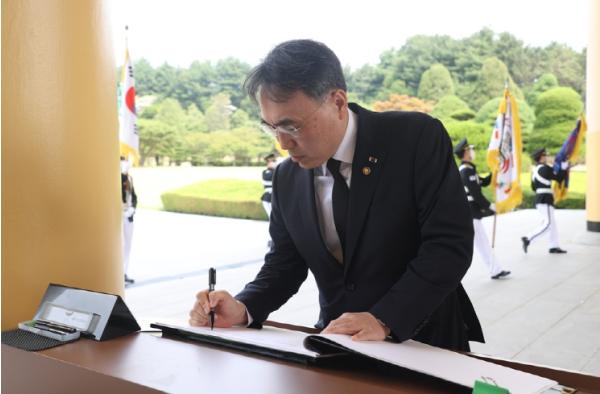[중앙뉴스라인, 한성영기자] 이종욱 조달청장이 5일 국립대전현충원을 방문, 순국순열과 호국영령에 참배했다. 이 청장이 방명록에 “젊음에 뛰던 가슴 나이들면 잦아들고, 조국애 새긴 감동 주름따라 깊어진다. 해마다 짙어지는 님에 대한 그리움”이라고 적고 있다.