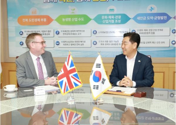 전북도에 따르면 5일 콜린 크룩스 주한영국대사 등 대사관 관계자들이 전북을 방문해 김관영 도지사를 예방하고 오는 8월 개최될 새만금 잼버리 대회와 양 지역 간 포스트-잼버리 청소년·문화·경제분야 등 다양한 교류협력 방안에 대해 논의했다고 밝혔다.