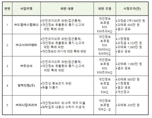 [중앙뉴스라인, 우제헌기자] 개인정보보호위원회는 6월 14일 위원회 전체회의에서 안전조치의무를 소홀히 하여 개인정보가 유출됐거나, 개인정보 유출신고·통지를 위반한 사업자 등 5개 사업자에게 총 4억 2,615만 원의 과징금과 3,620만 원의 과태료를 부과하기로 결정했다.