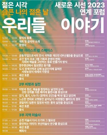 젊은 시각 새로운 시선 2023 《슬픈 나의 젊은 날》과 연계해 진행하는 이번 포럼은 최근 몇 년간 급격하게 변해 온 지역 문화예술계의 지형을 그린다. ▲‘아티스트 런 스페이스’ ▲‘비평과 실천’ ▲‘지역 미술사’ 이상 총 3부로 구성됐으며, 부산 지역을 중심으로 타지역 포함 총 10명/팀의 청년 발제자가 참가해 약 20분씩 발표할 예정이다.