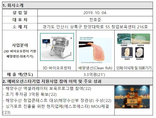 한편, 기존 예비 오션스타 기업 중 바이오 3D프린팅 기술로 생선 배양육을 개발하는 ‘바오밥헬스케어’는 해양수산 창업기획자 프로그램 지원을 받아 초기 투자금 3억 원을 유치했으며, 수산물 전자상거래 정보서비스를 제공하는 ‘더파이러츠’는 사업화 자금 등을 지원받아 506억 원의 매출을 달성하고 160억 원의 투자유치에 성공하는 등 꾸준히 성장하고 있다.