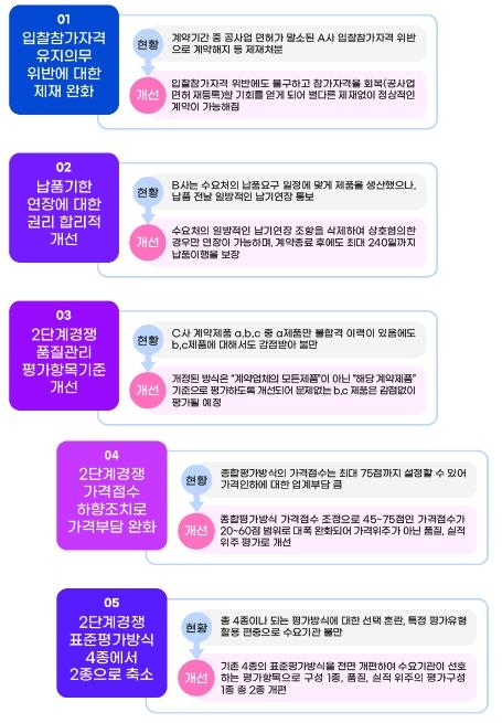 이번에 개정되는 내용은 조달기업의 각종 조달규제를 완화하고, 제품의 계약관리 강화, MAS 2단계경쟁 등 이용 편의성 제고에 중점을 뒀다.
