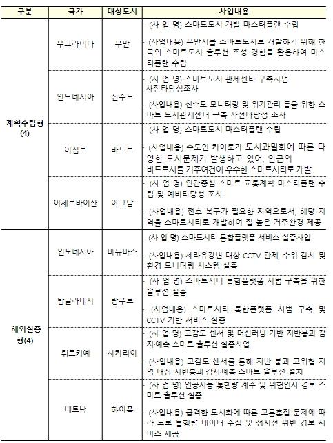 계획수립형은 해외도시에서 신청을 받아 스마트도시 개발과 관련된 기본계획 수립 등을 지원하는 사업으로 우크라이나 우만, 인도네시아 신수도, 이집트 바드르, 아제르바이잔 아그담에서 신청한 사업 4건이 선정됐다.