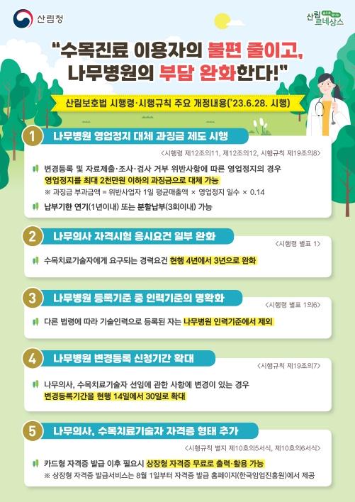 이 밖에 지난 13일 국무회의를 통과한 산림보호법 시행령 개정안도 28일 시행을 앞두고 있는데, 주요 내용은 ▲ 나무병원의 영업정지 처분을 대체하는 과징금 부과 세부 기준 마련, ▲ 나무의사 자격시험 응시요건 중 수목치료기술자의 경력요건을 현행 4년에서 3년으로 완화, ▲ 다른 법령에 따라 기술인력으로 이미 포함된 사람은 나무병원 인력기준에서 제외 등이다.