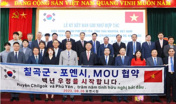 경북 칠곡군은 26일 베트남 타이응웬성 포옌시를 방문해 김재욱 군수와 용우옌 수안트엉 당 위원회 상임 부서기장을 비롯해 양 도시 업무담당자와 기업인 등 200여 명이 참가한 가운데 ‘우호 증진을 위한 양해 각서(MOU)’를 체결했다.