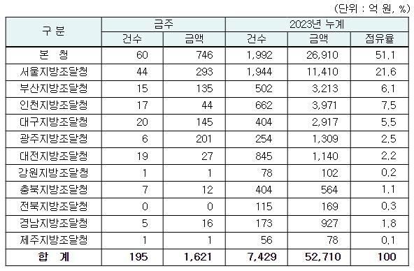 지역별 발주량을 보면 대전광역시 소재 본청 746억 원, 서울지방청 293억 원 등 2개청(1,039억 원)이 전체 금액(1,621억 원)의 64.1%를 차지하고 있으며, 인천 등 나머지 10개 지방청 582억 원이 각각 집행될 예정이다.