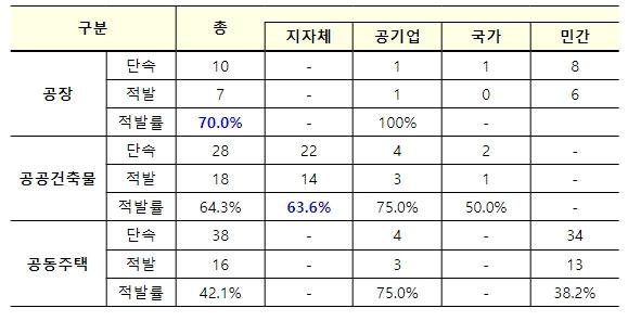 공종별로는 토목공사 현장(22%) 보다 건축공사 현장(51%)에서 적발률이 높았고, 건축공사 중에서는 공사 중 임시로 설치되는 건설용 리프트 등 가시설 공사 및 비계설치 공사를 불법하도급하는 경우가 많았다.
