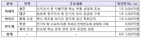 미래차 분야 특화단지는 자율주행, 전기차 등 미래차 전환에 따라 높은 수요가 발생될 것으로 기대되는 핵심부품들의 자립화, 내재화(전기차 모터 자립률 50%→90% 등)를 추진하고, 바이오 분야 특화단지는 코로나19 이후 바이오의약품 글로벌시장이 크게 성장함에 따라 백신 등 의약품 제조공정(배양→정제→완제)에 필수적인 원부자재 자립을 목적으로 한다. 아울러, 반도체 특화단지는 반도체 장비, 전력반도체 등 국내 반도체 생태계 강화를 추진한다.