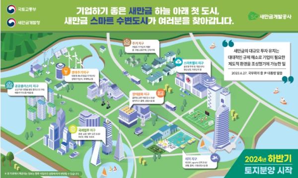 새만금 스마트 수변도시는 계획단계부터 수요자 중심의 맞춤형 비즈니스 모델을 마련하고 있으며, 주거, 상업, 교육, 문화, 의료, 첨단산업은 물론 수변을 활용한 레저, 관광 등 다양한 용도의 토지를 공급하여 고차원의 정주 환경 제공을 통한 쾌적한 생활공간을 구현할 계획이다.