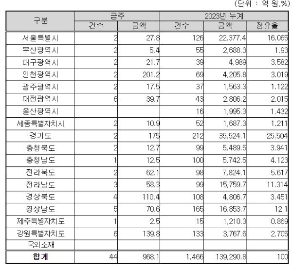 지역별로는 인천광역시 201억 원, 경기도 175억 원, 강원특별자치도 140억 원, 그 밖의 지역이 452억 원이다.