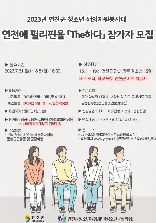 (재)연천군청소년육성재단은 오는 8일까지 청소년해외자원봉사 ‘연천에 필리핀을 The하다’ 참가자를 모집한다고 1일 밝혔다.