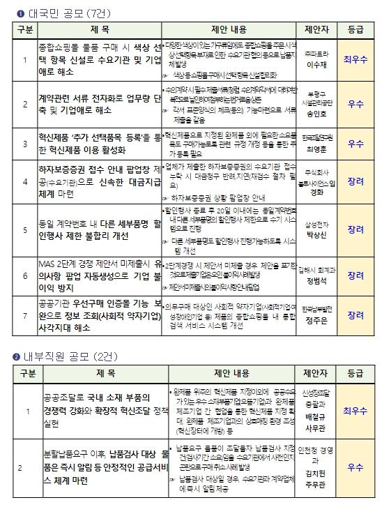 대국민 공모 최우수상은 색상 등 다양한 항목이 존재하는 가구류임에도 종합쇼핑몰 주문 시 색 선택항목이 없어 색상 등 확인까지의 시간 소요로 인한 납품지연과 불필요한 민원발생 등의 문제점 해소차원에서 종합쇼핑몰에 색상 등 선택 항목 신설을 제안한 ㈜파트라 이수재씨가 수상했다.
