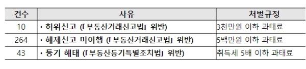 적발된 317건의 거래는 ①허위로 거래신고했거나, ②계약 해제 후 해제신고를 하지 않았거나, 또는 ③정상거래 후 등기신청만 하지 않은 경우로 구분할 수 있는데 3가지 모두 과태료 처분 대상이다.