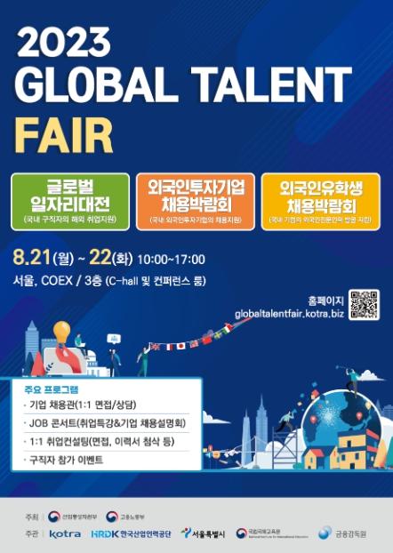 한국산업인력공단(이사장 직무대행 김영중)은 코트라, 국립국제교육원과 공동 주관하는 ‘2023 글로벌 탤런트 페어(GLOBAL TALENT FAIR)’를 서울 코엑스에서 21일 개최한다.
