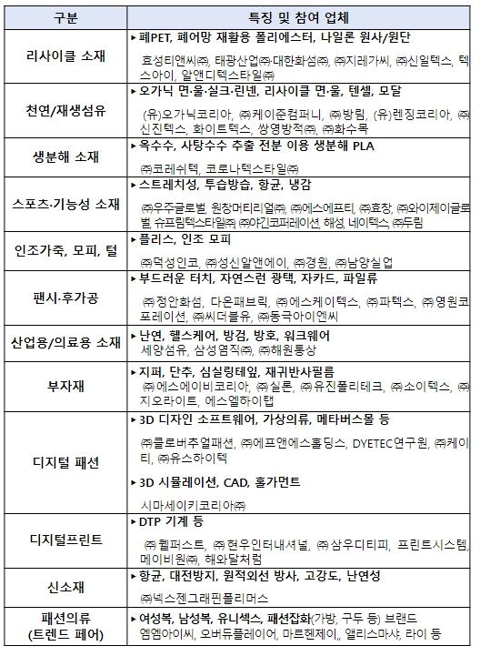 섬유패션 분야의 세계적인 트렌드인 지속 가능성(Sustainability)을 주제로 개최되는 이번 전시회에서는 국내에서 수거된 폐페트병을 활용한 재활용폴리에스터 섬유와 옥수수, 사탕수수 등에서 추출한 전분을 사용해 만든 생분해 섬유(PLA) 등 다양한 친환경·리사이클 소재를 만나볼 수 있다. 또한, 냉감 및 발열, 발수, 방수 등 기후 적응형 퍼포먼스 소재, 애슬레저를 위한 저지 원단 등 고품격 라이프 스타일을 위한 최신 기능성 소재들도 함께 전시되어 더욱 풍성한 볼거리를 제공할 것으로 기대된다.