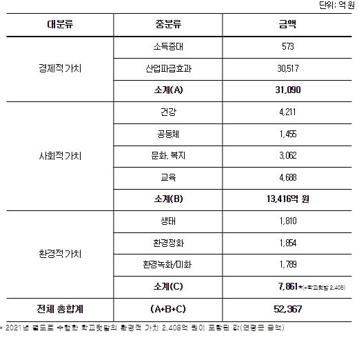 도시농업의 사회적 가치는 ▲신체적 활동과 심리?정서적 안정감 등 건강증진 4,211억 원 ▲가족관계 개선, 이웃 간 교류 증진에 따른 공동체 회복 1,455억 원 ▲여가, 취미활동 활성화 등 문화적 가치 3,062억 원 ▲미래세대에 제공하는 교육 증진 효과 4,688억 원 ▲총 1조 3,416억 원으로 분석됐다.