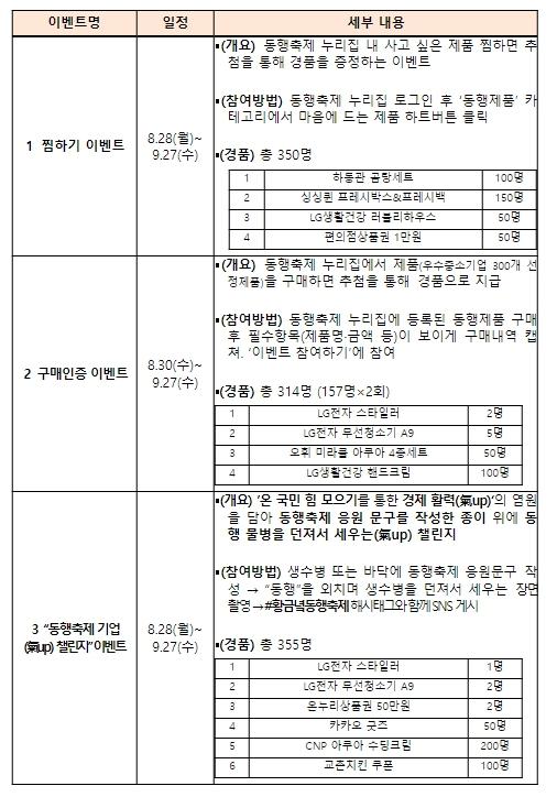 동행축제 우수제품 중 마음에 드는 제품을 ‘찜’하기만 해도 행사(이벤트) 경품의 행운이 주어진다. 동행축제 누리집(동행축제.org 또는 buykfesta.org 입력)에서 소개된 ‘동행축제 우수제품 300선’ 중 구매하고 싶은 제품의 상세 내용을 확인 후 ‘찜하기’를 선택하면 행사(이벤트) 참여가 완료된다. 행사(이벤트) 참여자 중 총 350명에게 ‘곰탕 세트’, ‘프레시백’ 등을 지급할 계획이다.