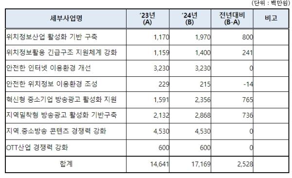 방통위는 ‘글로벌 미디어 강국 도약’의 초석 마련을 위해 ▲신?구 미디어 동행 성장 미래전략에 172억원, ▲차별없는 미디어 혜택 및 인터넷 언론 등의 사회적 책무 부여에 826억원, ▲디지털 신산업 자율성과 조화를 이루는 이용자 권익 보호를 위해 226억원 등을 편성했다. ’24년도 주요 추진사업은 다음과 같다.