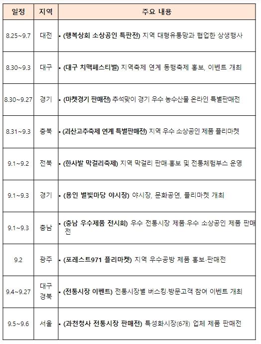 이외에도 충북 괴산 유기농 엑스포광장과 충남 당진시청에서는 각각 ‘괴산 고추축제 소상공인 특별판매전(8.31~9.3)’과 ‘충남 우수시장 황금녘 동행축제(9.1~3)’가 열리고, 광주시민회관에서는 ‘포레스트 971 플리마켓(9.2)’, 전주 신중앙시장에서는 ‘전주 막걸리축제(9.1~3)’ 등 전국에서 10여개의 크고 작은 행사가 열린다.