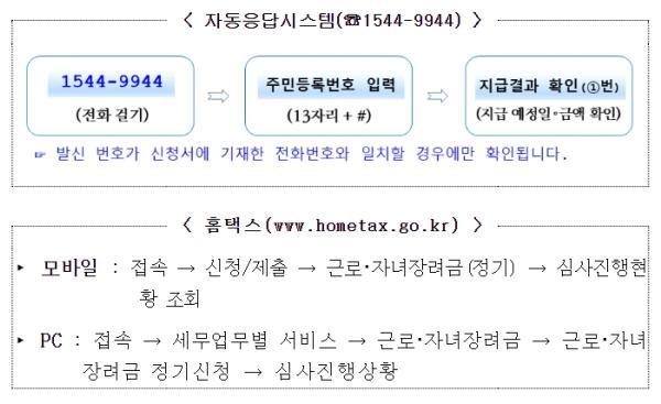(심사결과) 신청한 금액에 대한 심사결과는 모바일 또는 우편으로 안내했으며, 자동응답시스템(☏ 1544-9944), 홈택스(모바일, PC), 장려금 상담센터(☏ 1566-3636)에서도 확인할 수 있다.