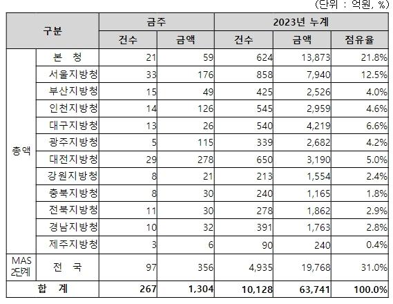 지역별 발주량을 보면, 총액계약 대상 948억 원 중 본청이 59억 원으로 6.2%를 집행하고 서울청 등 11개 지방청에서 889억 원을 각각 집행할 예정이다.
