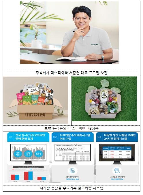 ‘미스터아빠’는 생산지 인근 물류센터 및 현지 농가와 연결된 소분센터를 통해 지역 농식품 유통-소비 통합관리 서비스를 제공하고, 자사 상표상품(PB) 판매하는 신선식품 유통 전문 새싹기업(스타트업)이다.