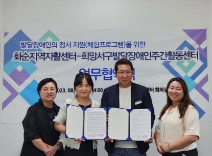 [중앙뉴스라인, 이대수 기자] 화순군에서 위탁 지원하는 화순지역자활센터에서는 지난 30일 발달장애인의 정서 지원 프로그램 개발·진행을 위해 광주광역시 서구에 소재한 희망 서구 발달장애인 주간 활동센터와 업무협약(MOU)을 진행했다고 밝혔다.