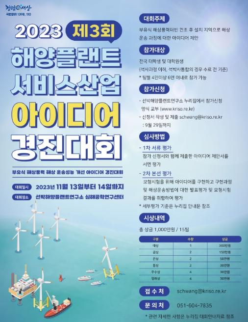 [중앙뉴스라인, 우제헌기자] 해양수산부와 선박해양플랜트연구소(소장 홍기용, KRISO)는 해양플랜트 서비스산업에 대한 청년들의 관심을 유도하고 미래 해양산업을 이끌어 갈 인재를 양성하기 위해 ‘2023년 해양플랜트 서비스산업 아이디어 경진대회’를 개최한다.