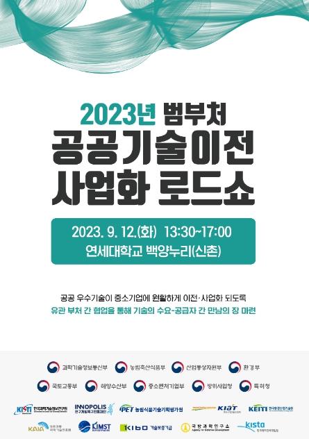 [중앙뉴스라인, 우제헌기자] 특허청은 과학기술정보통신부, 국토교통부, 농림축산식품부, 산업통상자원부, 중소벤처기업부, 해양수산부, 환경부, 방위사업청과 함께 우수 공공기술의 민간 이전·사업화 촉진을 위한 『2023년 범부처 공공기술 이전·사업화 로드쇼』를 9월 12일 13시 30분, 신촌 연세대학교 백양누리(서울시 서대문구)에서 개최한다고 밝혔다.
